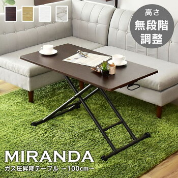 配送について 送料 無料 (北海道+10,000円・沖縄・離島・一部地域見積り) ●商品詳細 -infomation- 商品名 ガス圧昇降テーブル Miranda100cm 【ミランダ 100cm】 サイズ 本体:約幅100×奥行55×高さ11.5〜70(cm) 材 質 天板:18mm合成樹脂化粧繊維板 フレーム:スチール 重 量 約13kg 梱包サイズ 幅122×奥行60×高さ14(cm) 梱包重量 総重量:約14.5(梱包材等含む) 備 考 ※他商品との同梱は出来かねます。